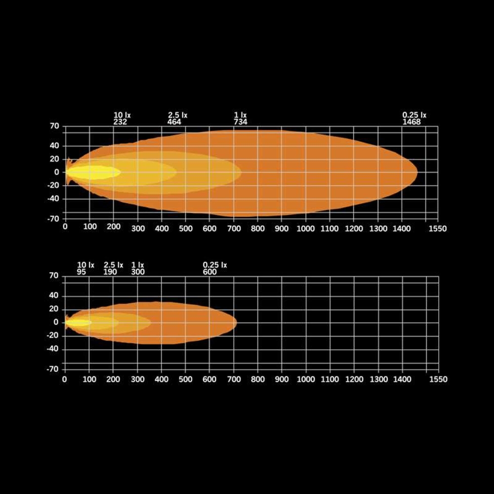 - Utvidet rekkevidde og bredere lysbilde: Se lenger og få et dramatisk bredere synsfelt – over fire ganger bredere enn bilens vanlige fjernlys – noe som gjør at du kan forutse potensielle farer og reagere mer effektivt. Denne løsningen har et faktisk lysutbytte på 4979 lumen og belyser 418m (ved 1 LUX), noe som gir enestående sikt.