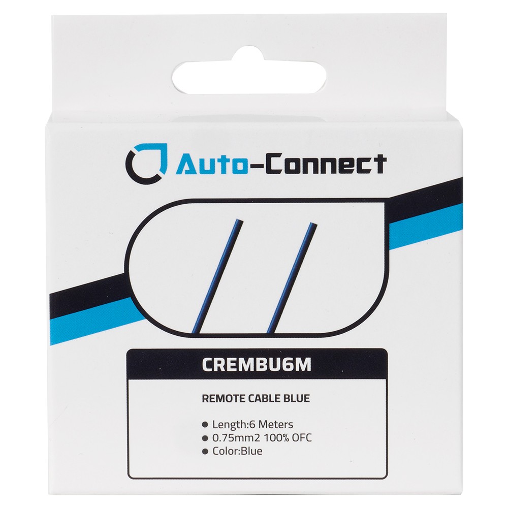 CREMBU6M fra Auto-Connect er et 6 meter langt blått 0.75mm² kabel i 100% kobber. Hovedsakelig er den ment å brukes som remotekabel, fra effektforsterker til bilstereo eller for eksempel høy til lavnivåomformer.