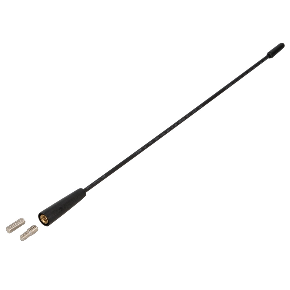 Antennens dimensjoner er en lengde på 34,5 cm med en 6 mm gjenge og en adapter for M6>M6 samt M6>M5 ekstern.