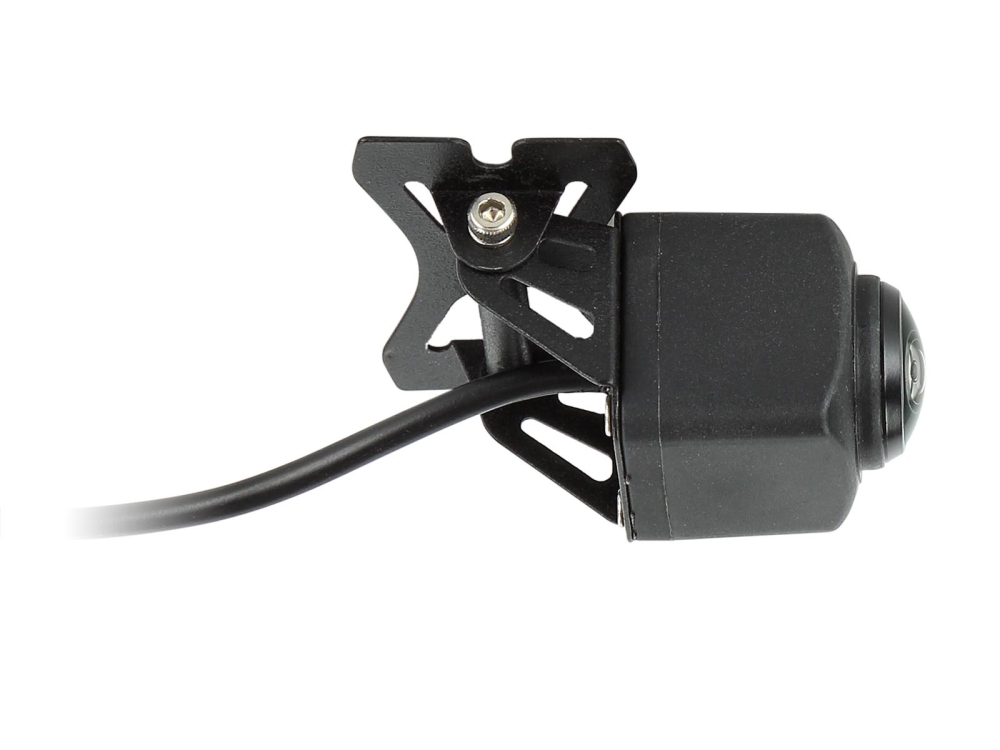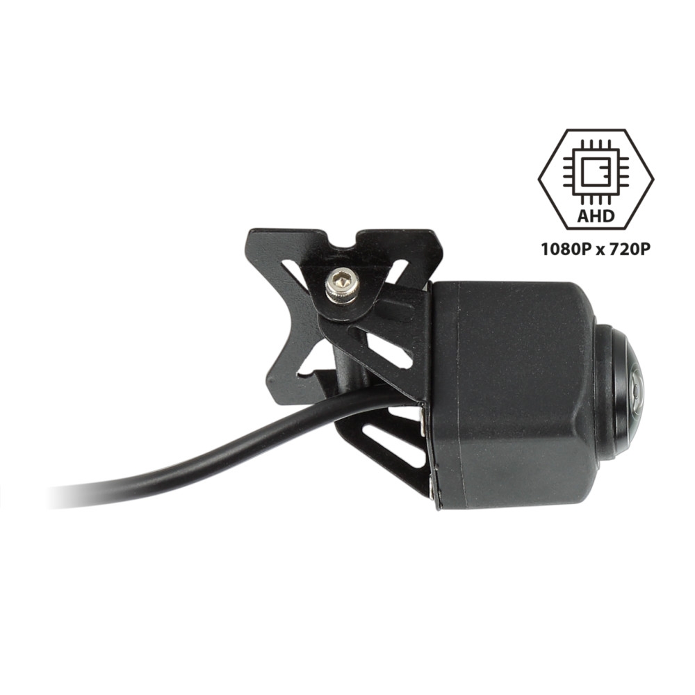 Produktet er designet i plast med et justerbart metallfeste og har en svart farge. Kameraet har en bildesensor på 1/2,8 AHD og gir en oppløsning på 1080 x 720 piksler. Det har en linse med et diagonalt synsfelt på 230°, som gir et horisontalt synsfelt på 180° og vertikalt synsfelt på 140° pluss 5°. Kameraet er egnet for kontinuerlig drift og bør kontrolleres for riktig synsvinkel og justering på installasjonsstedet med en testmonitor før installasjon. Kamerakontaktene inkluderer en rød kabel for +12V, en svart kabel for jordforbindelse, og en gul RCA-kabel for video. Det finnes også en grønn jumper for å aktivere/deaktivere retningslinjene og en hvit jumper for å aktivere/deaktivere speilfunksjonen. Kameraet leveres med en 1 meter lang pigtail med 4-pins ACV-systemkontakt og inkluderer installasjonsutstyr som en fremovervendt kamerabryter og forskjellige kamerakabelforlengelser.
