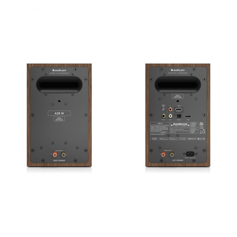 A28 W har rene linjer, stoffkledd front og diskret format som gjør at de passer like godt ved siden av TV-en som i en hylle. De selges som par – forsterkeren sitter i venstre høyttaler, mens høyre kobles via høyttalerkabel. På baksiden finnes feste for veggmontering, men den beste lydopplevelsen får du når de står fritt.