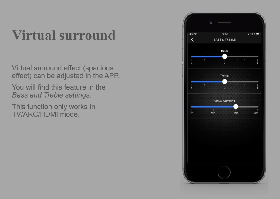 Forgjengerne hadde doble optiske innganger. På nye A26 og A36 er den ene optiske inngangen borte og blitt erstattet med HDMI med ARC. En HDMI-kabel blir derfor den perfekte bryggen mellom TVen og høyttalerne. Har man apper på en smart-TV, som Netflix, YouTube, NRK m.m., så blir lyden sendt fra TVen og ut til høyttalerne. En funksjon som kommer bra med er via HDMI ARC kan høyttalernes volum styres via TV-fjernkontrollen. Utover dette finnes det en Virtual Surround-funksjon som er eksklusiv for HDMI ARC. Denne justeres vi appen og gir en økt virtuell surround opplevelse når man ser på film. Det er også en redelig analog kabel inngang for 3.5 mm, om man skulle ønske å spille fra en MP3-spiller eller slikt.