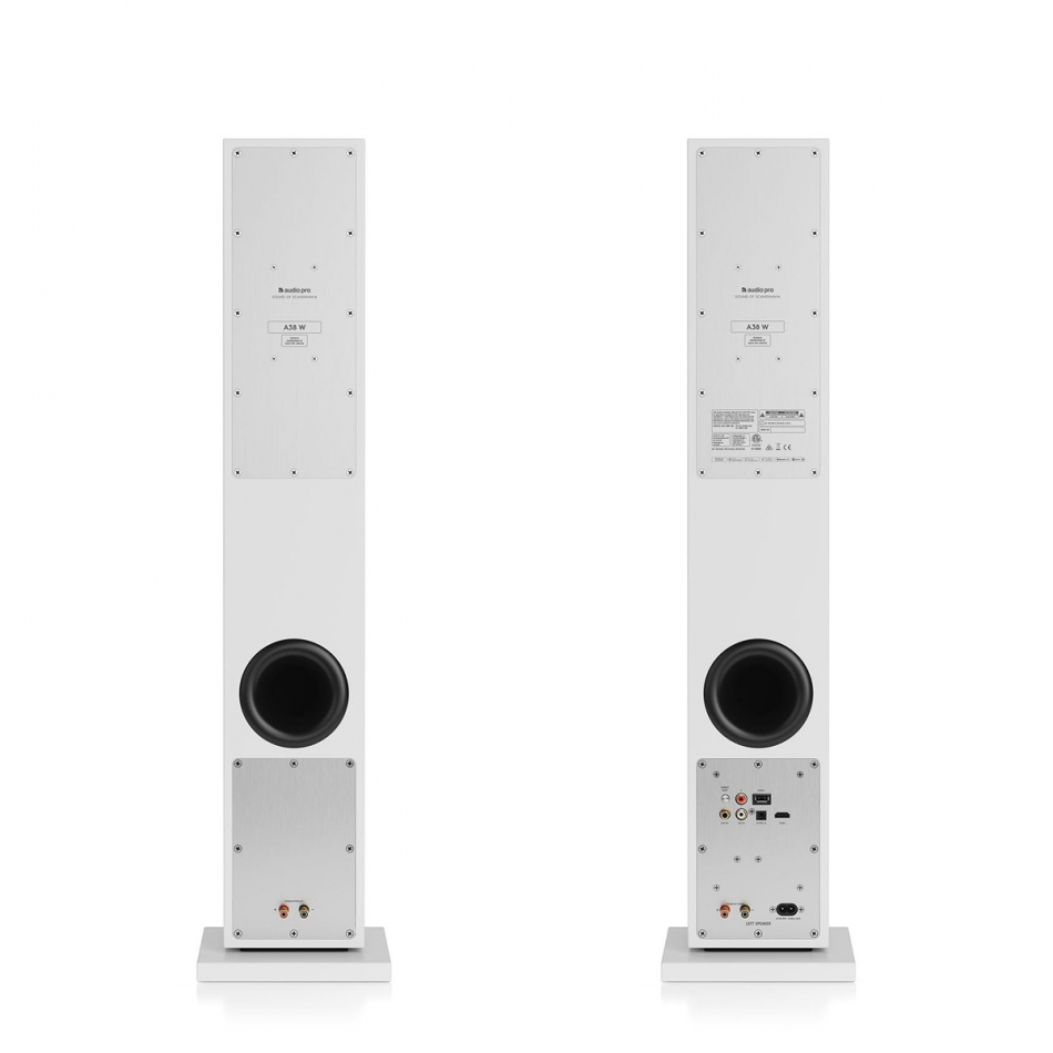 Når WiFi ikke er tilgængelig, findes Bluetooth 4.2. På bagsiden finder du også en RCA-indgang for eksterne kilder som CD-afspiller eller pladespiller (med RIAA). Ligesom de øvrige modeller i serien kan A38 W re-streame lyd fra disse kilder til andre Audio Pro-højttalere i netværket, med undtagelse af HDMI ARC.
