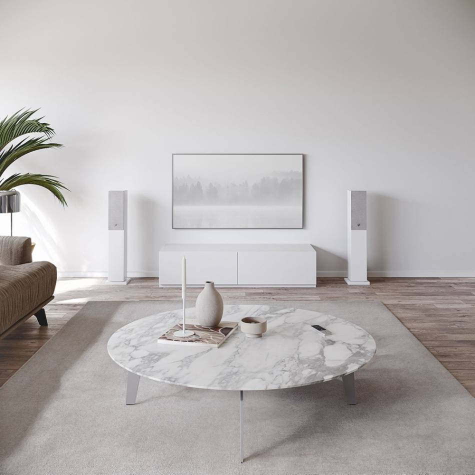 A38 W er en gulvhøjttaler med et diskret formsprog, stofbeklædt front og slank silhuet. De sælges som par, hvor forstærkeren sidder i den venstre højttaler og kobles til den højre via højttalerkabel. Kombinationen giver dig både kraft og præcision i en elegant form.