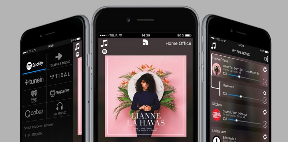 Aktiv og stilig aktiv enkelt-stereohøyttaler med WiFi, Bluetooth og spille. Stilig lær håndtak på toppen.