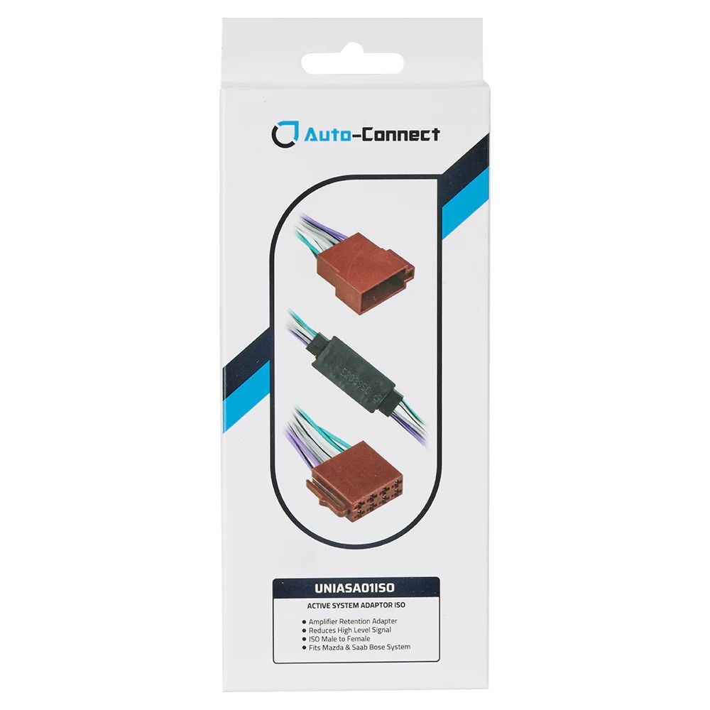 Auto-Connect UNIASA01ISO er en signaltilpassende adapter som brukes når du monterer en ettermarkedsstereo i en bil med fabrikkmontert forsterker som forventer lavnivåsignal, til tross for at signalet går via høyttalerkontakter. Adapteren reduserer stereoens høynivåsignal til riktig nivå for OEM-forsterkeren og gjør det mulig å beholde originalforsterkeren uten å modifisere bilens kabler.