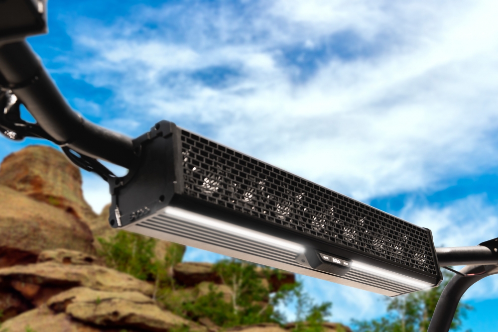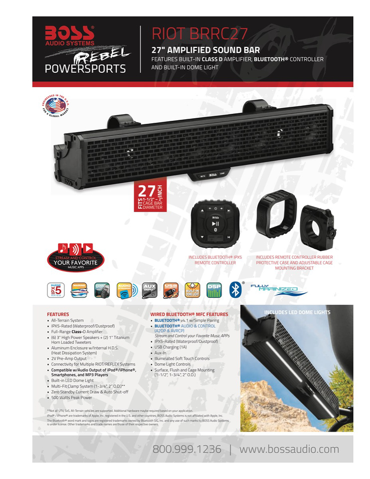 BOSS BRRC27 er en soundbar med IPX5-sertifisering med innebygd Bluetooth for ATV, UTV eller båten. Perfekt hvis man har en targabøyle på båten eller på ATVen for en smidig løsning for å strømme musikk trådløst!