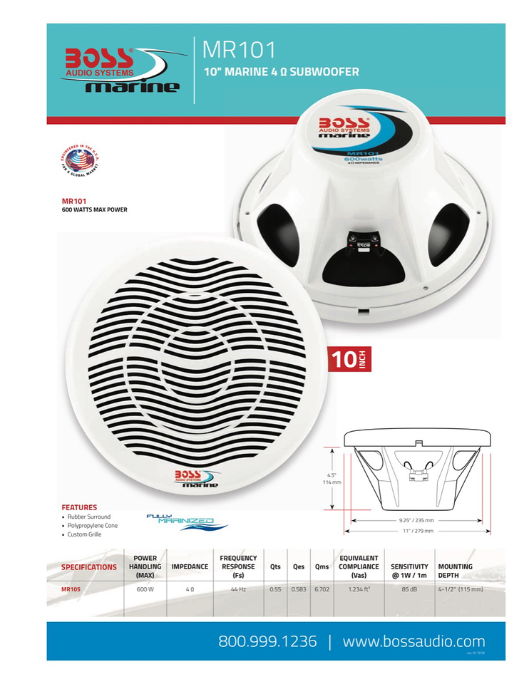 BOSS MR101 er en 10" som kan brukes i våte miljøer, noe som passer perfekt i båten din. Utvid lydanlegget ditt med denne bassen som gir 300W RMS i 4 ohm, med en følsomhet på 85dB. Med denne kommer du til å få en god basslyd i båten garantert.