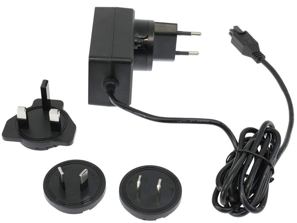 Brodit 941026 – Ladekabel. Med 220V-kontakt, 5,4V 2,7A og 6-pins Molex-utgang. EU-, US-, UK- og AU-adaptere inkludert. Vegglader med 6-pins Molex. Brukes hvis man ønsker å oppgradere sin Aktive holder til 220V lading.