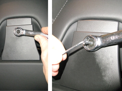 2. Plasser festets tynne underdel i sprekken i ryggstøtten.