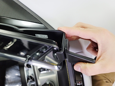 1. Press inn den vinklete kanten på festets venstre del i sprekken mellom panseret rundt instrumentpanelet og baksiden av skjermen.