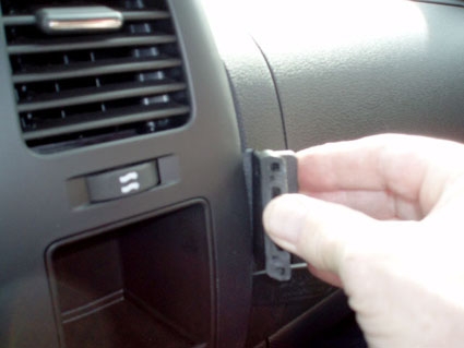 1. Press inn den medfølgende spalteåpneren i spalten i instrumentpanelet for å utvide spalten. Fjern beskyttelsesplast fra dobbeltsidig tape på Del 1.