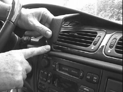 3. Press inn holderens øverste del i spalten ved 2 mellom panelet rundt luftventilene og den utstikkende instrumentpanelet.