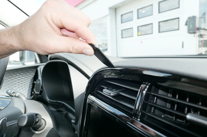 1. Bruk den medfølgende våtservietten til å rengjøre området der ProClip-festet skal monteres. Press inn den medfølgende spalteåpneren mellom rammen som omgir luftventilen og instrumentpanelet for å utvide spalten. Fjern beskyttelsesfilmen på den dobbeltsidige tapen på ProClip-festet.