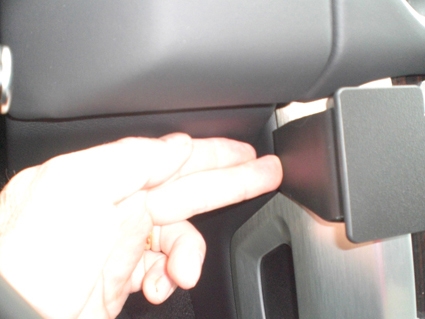 2. Press nedover på monteringsplattens venstre side slik at festet bøyes fremover og den vinklet venstre delen fester seg rundt konsollens kantpanel.