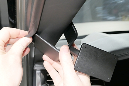 3. Press festet fremover/oppover slik at den vinklet overkanten fester seg på A-stolpen ved frontruten. Press nedover på festets overdel slik at den vinklet kanten fester seg godt på A-stolpen.