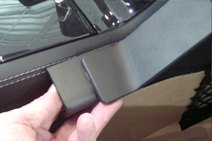 1. Bruk den medfølgende våtservietten til å rengjøre området der ProClip-festet skal monteres. Fjern beskyttelsesplasten på den dobbeltsidige tapen på ProClip-festet. Press inn/krok festets vinklet nederdel under konsollkanten.
