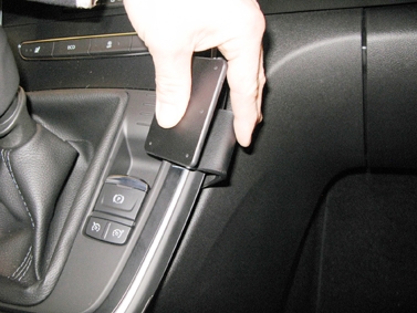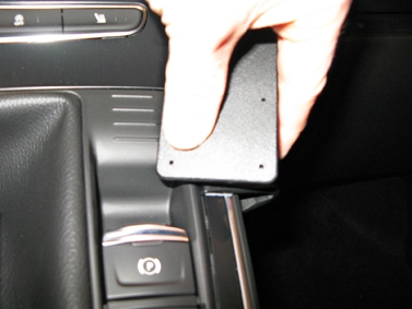 3. Press nedover på festets høyre del slik at den vinklete kanten fester seg ordentlig under midtkonsollen.