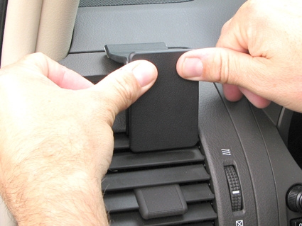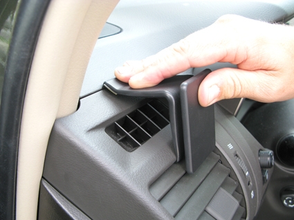 2. Press festet fremover slik at den vinklete overdelen fester seg i sprekken mellom rammen rundt luftventilen og instrumentpanelet.