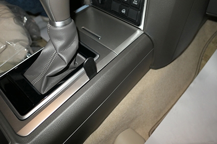 1. Press inn den medfølgende spalteåpneren mellom midtkonsollen og panelet rundt girspaken for å utvide spalten. Bruk den medfølgende våtservietten til å rengjøre området der festet skal monteres. Fjern beskyttelsesplasten på den dobbeltsidige tapen på festet.