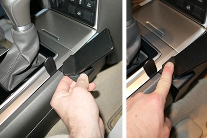 2. Press inn festets vinklet nederdel i spalten i midtkonsollens sidevegg.