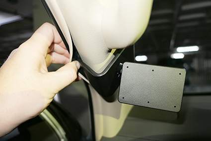 3. Press festet fremover/oppover slik at den vinklete overkanten fester seg på A-stolpen ved frontruten. Press nedover på festets overdel slik at den vinklete kanten fester seg godt på A-stolpen.
