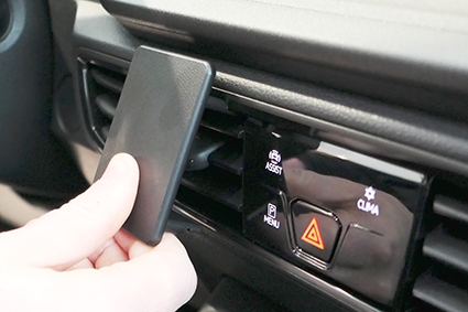 1. Bruk den medfølgende våtservietten til å rengjøre området der ProClip-festet skal monteres. Fjern beskyttelsesplasten på den dobbeltsidige tapen på festet. Fest den sporfrådde oversiden av festet under rammen som omgir luftventilen.