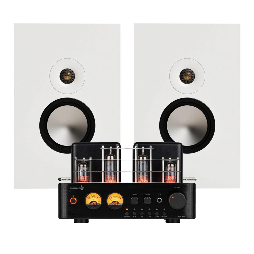 Dayton Audio HTA100 sammen med Monitor Audio Bronze On-Wall 7G i hvitt gir deg et stilrent og velbalansert stereopakke for stuen. Med elegant design og solid teknologi fra begge merkene får du en lydopplevelse som både føles levende og detaljert, perfekt for musikkelskeren som ønsker kvalitet og enkel montering uten kompromisser.