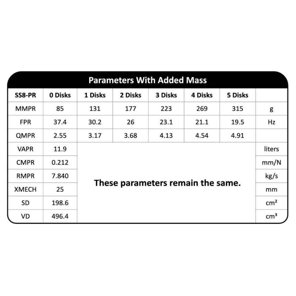 En passiv radiator er et klokt valg når kabinettet må holdes lite, men man likevel vil ha lav tuning uten lange porter. SS8-PR er lett å arbeide med i denne typen løsninger. Den bevegelige massen kan tilpasses med de medfølgende vektene, og Dayton Audios SMS-konstruksjon plasserer massen mellom spider og oppheng for å holde bevegelsen stabil og symmetrisk. Det gir en løsning som er enkel å finjustere etter kabinett og basselement.