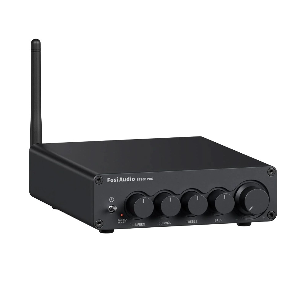 Fosi Audio BT30D Pro (32 V) er en kompakt 2.1-kanals forstærker med Bluetooth og separat subwooferstyring, bygget omkring dobbelte TPA3255-kredsløb fra Texas Instruments. Den driver to passive højttalere og en passiv basskasse, samtidig med at den også kan levere til aktive enheder via pre-out. Med den medfølgende 32 V, 5 A-strømforsyning leverer den op til 165 W x 2 til højttalerne og op til 350 W til sub-kanalen, hvilket gør den til en kraftfuld men smidig løsning til skrivebord, stue eller mindre hjemmebiograf.
