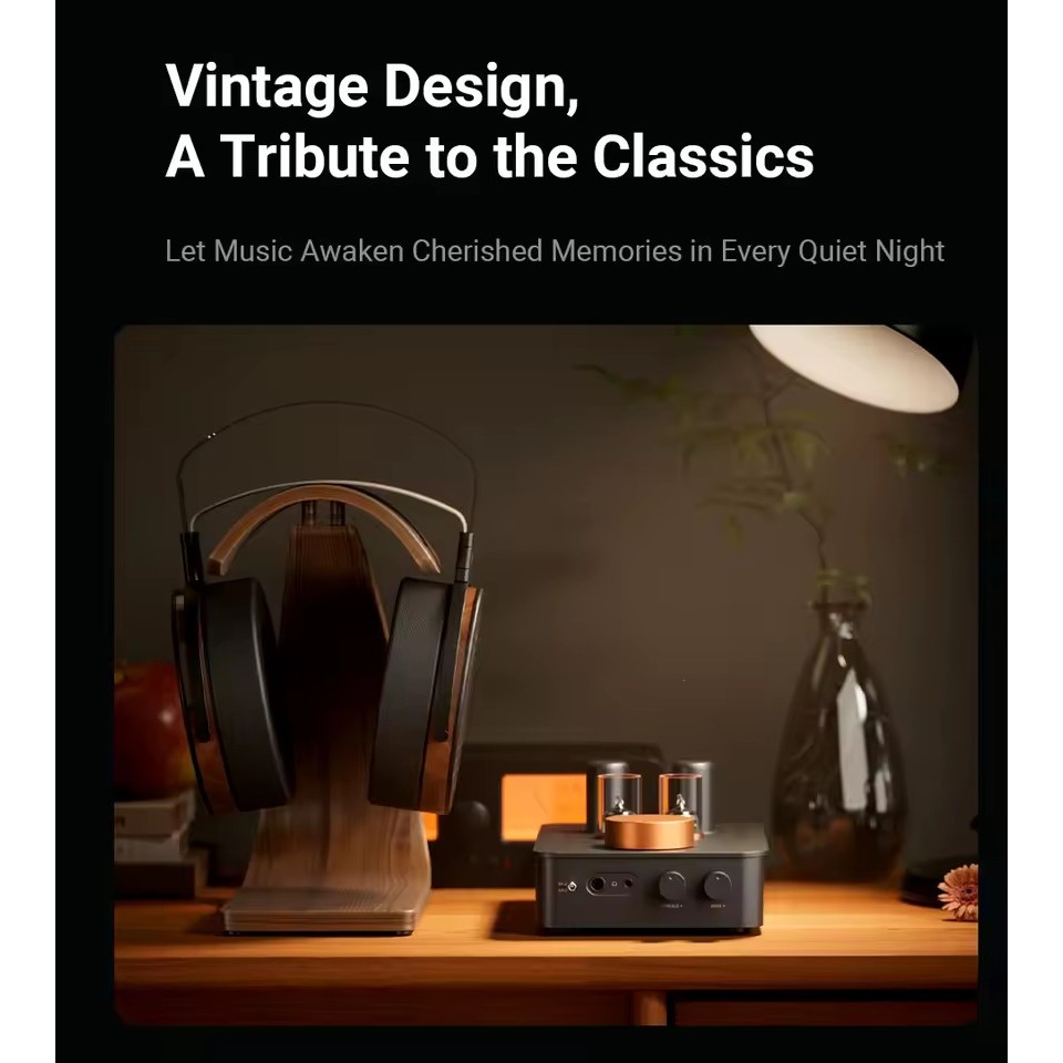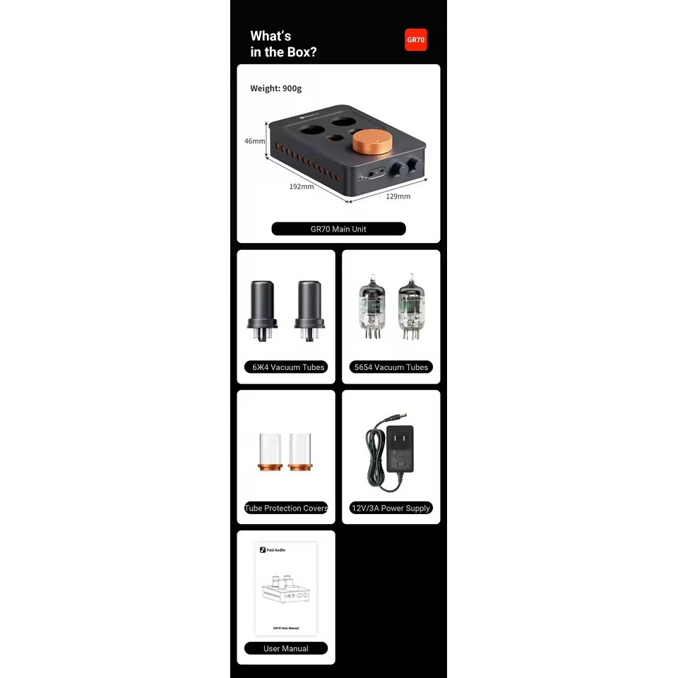 Fosi Audio GR70 er en ren rørbasert hodetelefonforsterker som også fungerer som forforsterker i et hjemmelydsystem. Med to 5654W og to 6Ж4/6Ж8-rør i en totrinnskonstruksjon, kombinerer den klassisk rørkarakter med moderne presisjon. Den er bygget for hodetelefoner mellom 16 og 300 ohm og tilbyr justerbar impedans samt bass- og diskantkontroller, noe som gjør den fleksibel både for seriøs lytting og for integrasjon i et stasjonært HiFi-anlegg.