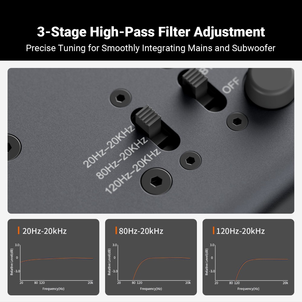 - Justerbart høypassfilter i tre trinn for bedre integrasjon med subwoofer