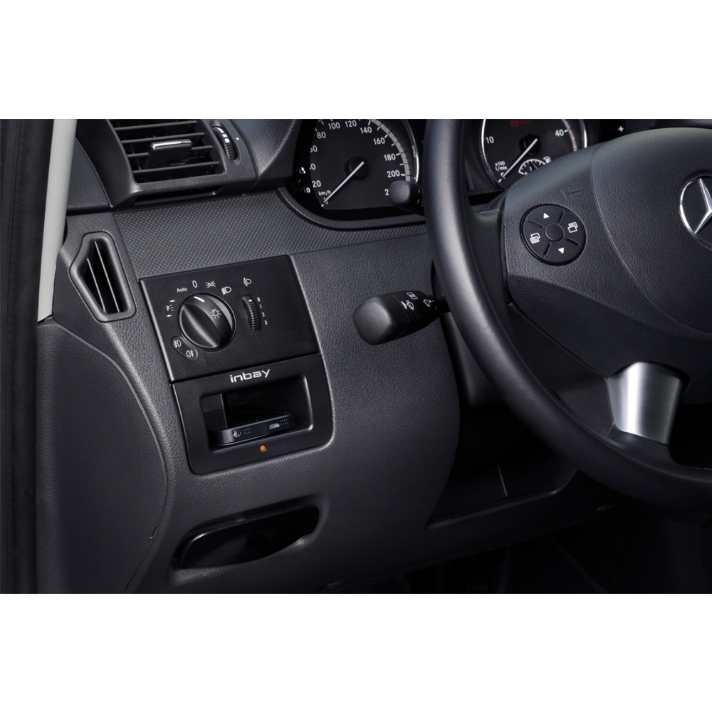 ACV 241190-56-1 er en INBAY® lomme for Mercedes Vito/Viano (W639) som muliggjør trådløs induktiv lading av smarttelefoner. Produktet er laget i Tyskland og støtter en effekt på opptil 10 Watt.