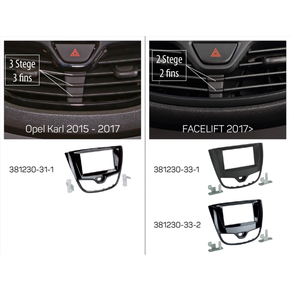 ACV 381230-33-2 er en 2-DIN fasadeplate i pianolakk, spesielt designet for Opel Karl-modeller fra 2017 til 2019. Denne monteringsrammen muliggjør en profesjonell installasjon av en ettermarkedsstereo, noe som gir et pent og integrert utseende med bilens interiør.
