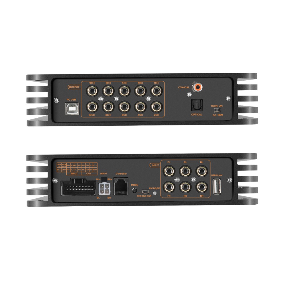 Den integrerte forsterkerdelen leverer 4x25W RMS ved 4 Ohm og 4x40W RMS ved 2 Ohm. Det er mer enn nok til å drive for eksempel diskant og mellomtone aktivt, eller som en smart effektbase i en installasjon der du deretter bygger videre med eksterne forsterkere via de 10 RCA-utgangene.