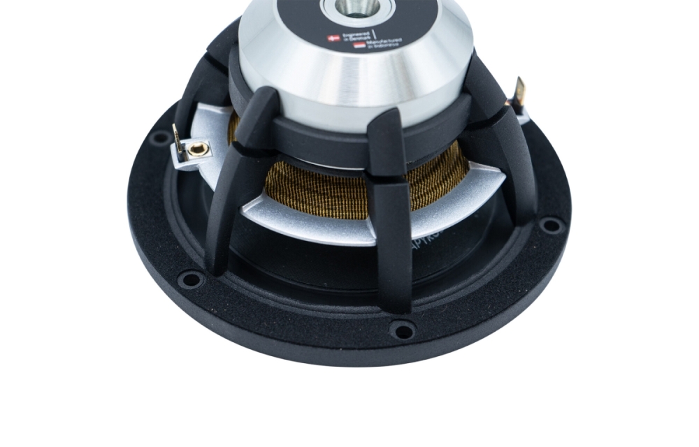 Elementet har et robust, ventilert og aerodynamisk aluminiumschassis som gir høy styrke og reduserer luftkompresjon i spalten. Det myke gummiopphenget og avansert BIMAX-spindel gir lav mekanisk demping og stabil linearitet over bevegelsen, noe som forenkler integrering i kabinettet. Pakning og skruehull er utformet for å redusere uønsket resonans og kobling til kabinettet. Samlet gir konstruksjonen stabilitet og enkel montering for en ren lydgjengivelse.