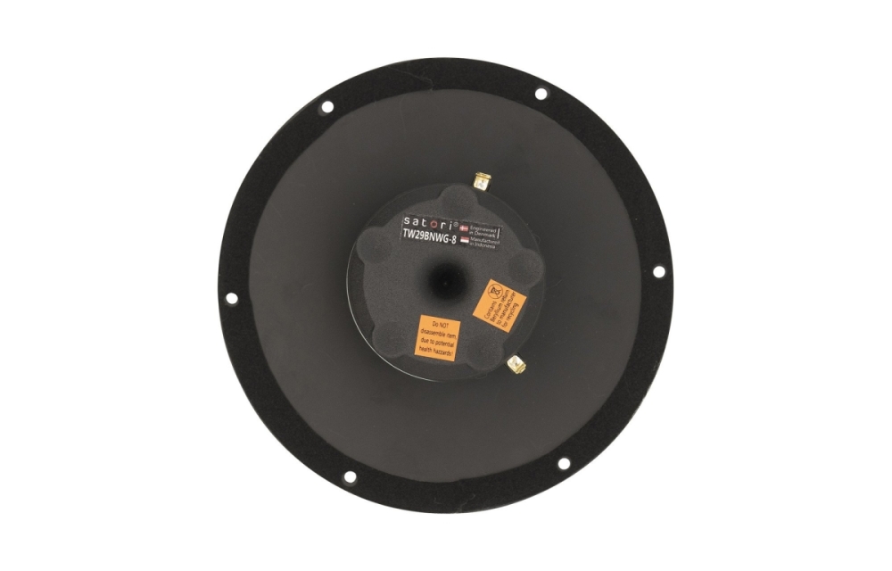 SB Acoustics Satori TW29BNWG-8 er en 1" diskant med resonansfri beryllium-dome og integrert bølgeleder på 170 mm, som gir kontrollert spredning og høy effektivitet. Den har doble balanserte kompresjonskamre og kobberkapsler som minimerer induktans og fasevridning, sammen med en kraftig neodymmotor med T-formet polstruktur for lav forvrengning. Bakre kammer i støpt aluminium med optimalisert demping gir en naturlig og presis gjengivelse selv ved høye lydnivåer.