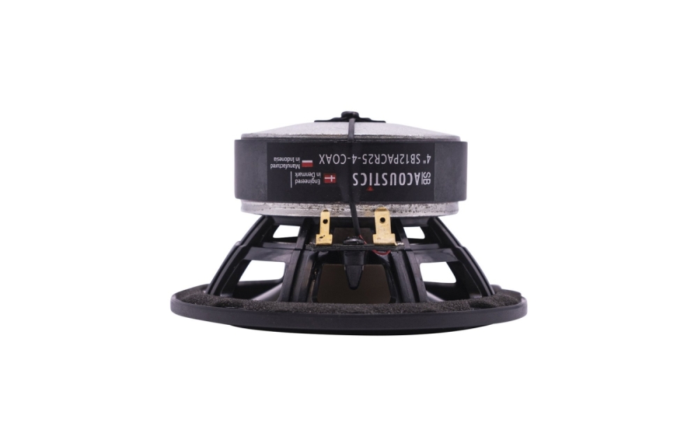 SB Acoustics SB12PACR25-4-COAX er en 122 mm (4") koaksialhøyttaler fra PAC-serien, som passer utmerket i kompakte bil- og lydsystemer. Den anodiserte aluminiumskonen og det store ventilerte motorsystemet gir lav forvrengning og effektiv kjøling, noe som gir et klart og dynamisk lyd med god detaljgjengivelse. Den kompakte dome-diskanten med stor surround sikrer en jevn høyfrekvensgjengivelse, samtidig som den lave impedansen på 4 ohm gjør høyttaleren lettdrevet med de fleste forsterkere.