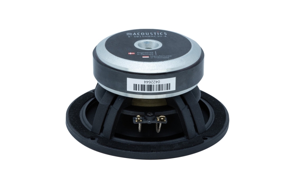 SB Acoustics SB15NBAC30-4 er en 5-tommers bass/mellomtone med geometrisk forsterket aluminiumkjegle og ventilert støpt aluminiumsramme som gir høy stivhet og lav kompresjon. Elementet har en myk gummikant for forbedret transientrespons, CCAW-talspole med langvarige sølvledere og en utvidet kobberhylse på polstykket som reduserer induktans og forvrengning. Dette gjør det til et stabilt og detaljert valg for mellomtone og bass i kompakte lydsystemer.