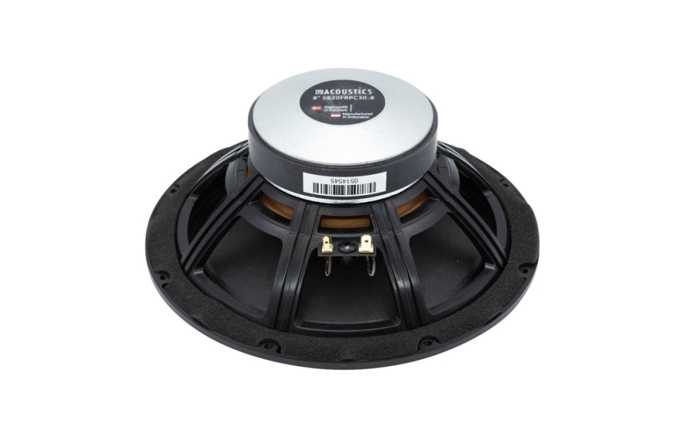 SB Acoustics SB20FRPC30-8 er et 8-tommers fulltone høyttalerelement med integrert whizzer-membran som utvider frekvensområdet opp i mellomtonen. Elementet har en internt produsert naturfibermembran og en lettvekts skumoppheng som gir lav demping og god kontroll. Med 8 ohm impedans og 92 dB følsomhet passer det godt for både kompakte og større lydsystemer hvor man ønsker tydelig mellomtone og god dynamikk uten separat diskant.