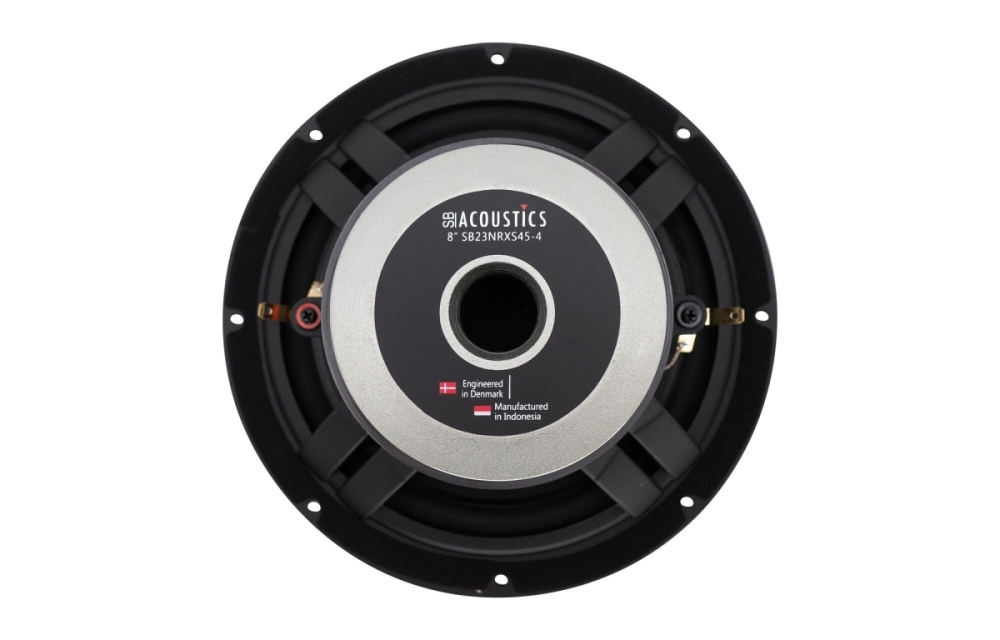 SB Acoustics SB23NRXS45-4 er en 8-tommers bass/mellomtone som passer til lydsystemer hvor tydelig og ren bassgjengivelse kreves med lav forvrengning. Den har en ventilert konstruksjon og gummioppheng som gir rask transientrespons og minimerer kompresjon, noe som gir en klar og dynamisk lyd. Med 4 ohm impedans og 60 W effekttoleranse passer den godt i både lukkede og bassreflekskasser og er enkel å montere takket være sitt grunne design.