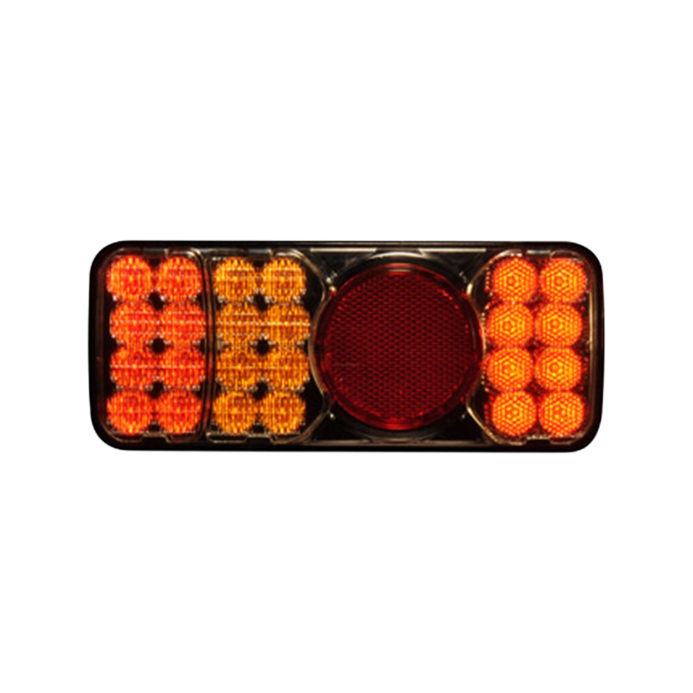 LED baklampe med fem funksjoner for venstre og høyre side, inkludert baklys, bremselys, blinklys og baklykt, i elegant design.