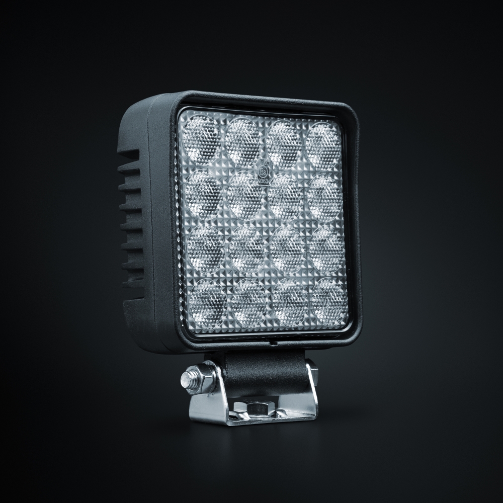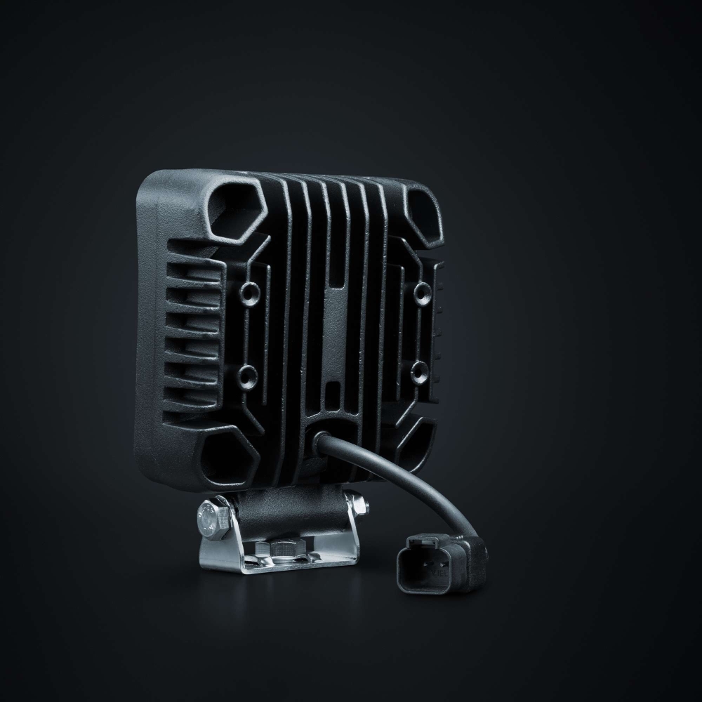 Svartlakkert hus i aluminium og linse i polykarbonat. Materialvalgene gjør den slitesterk og immun mot steinsprut.