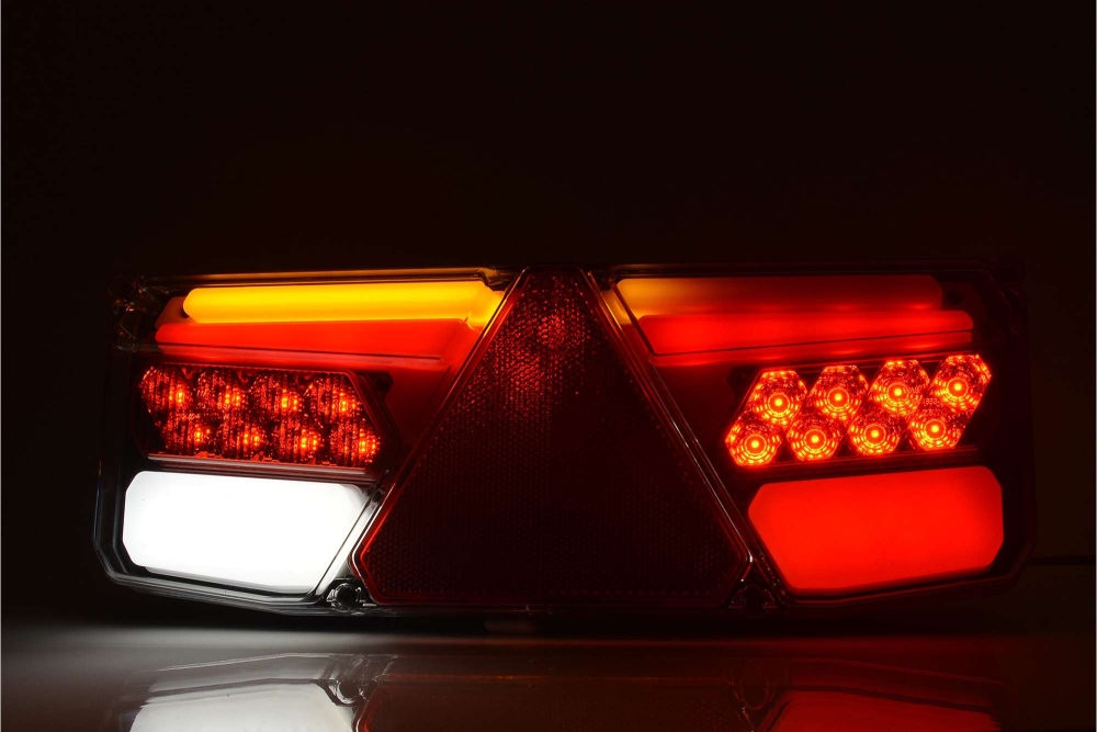 Baklys med neoneffekt, fem funksjoner: bak, brems, dynamiske blinklys, kjørelys og baklys, for høyre, tilhenger og trekantfeste.