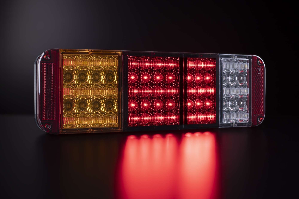 Baklykt med fem funksjoner (baklys, brems, blinklys, kjørelys, baklys) i LED, enkel design og lang holdbarhet.