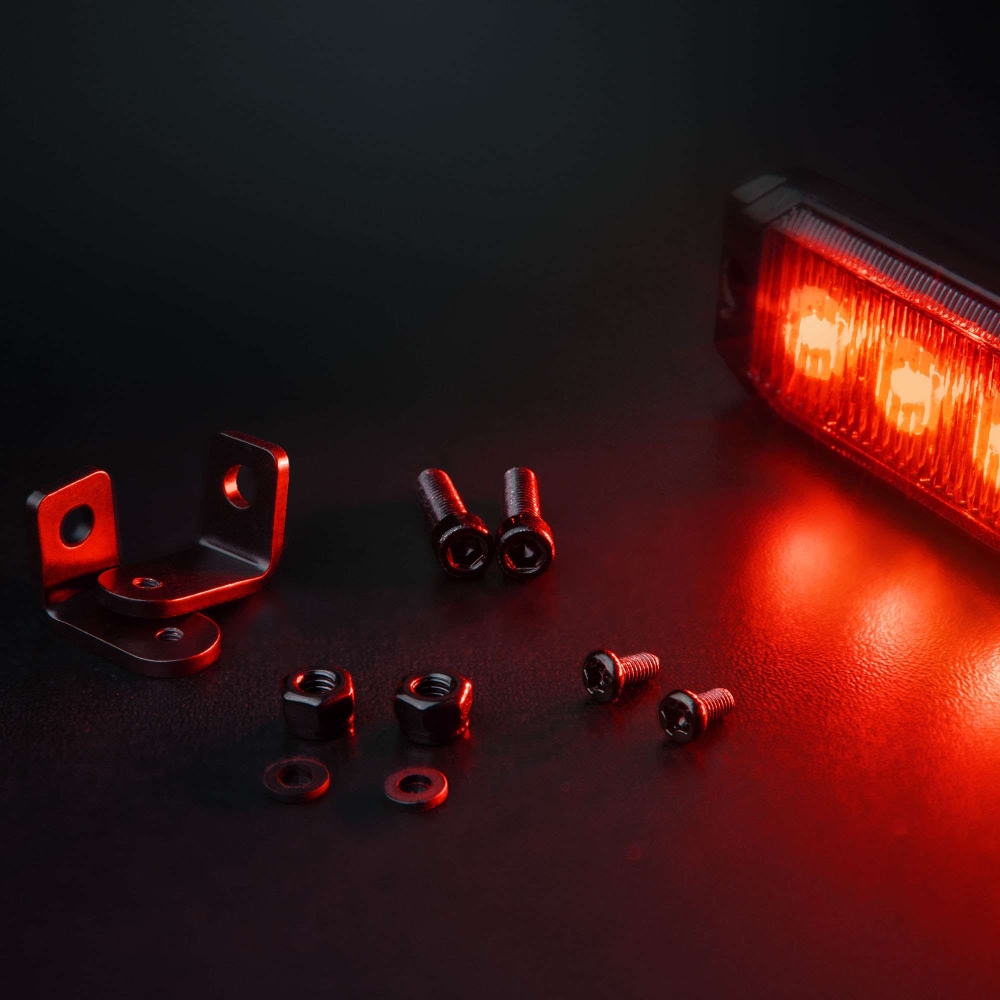 De 6 LED-diodene produserer en kraftig glød, med høy synlighet og iøynefallende stil. Takket være det lave strømforbruket, 0,9–3,3 W, kan du enkelt installere så mange du vil. Dark Knight SM6 er E-godkjent ECE R148 og EMC-sertifisert ECE R10.