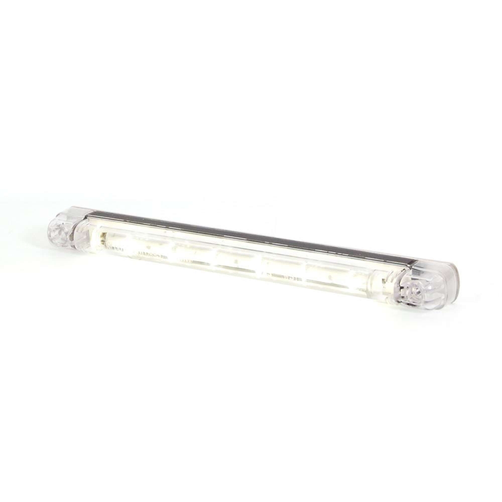 Avlang, slank DRL/posisjonslys med LED, klart glass, avrundede kanter og lettmontert design.
