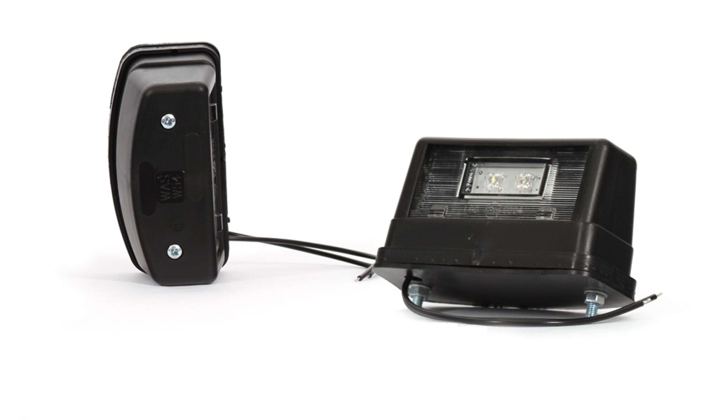 LED nummerplatebelysning med svart overflate og klart glass nederst. Rektangulær, robust form og 2 dioder.Produktark
