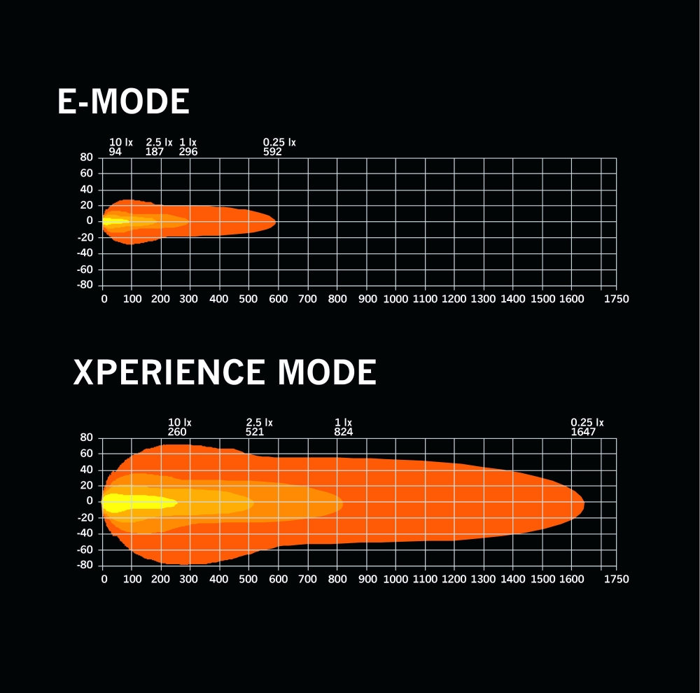 Lampens langdistanselys gir et bredt og jevnt lysbilde med 13,6 graders spredning og en rekkevidde på over 800 meter. Xperience-modusen gir høy effekt og maksimal sikt, mens E-modusen er godkjent for veitrafikk og har lavere effektforbruk. Posisjonslysene i hvitt og rav gir tydelig markering uten å forstyrre designen når de er av.