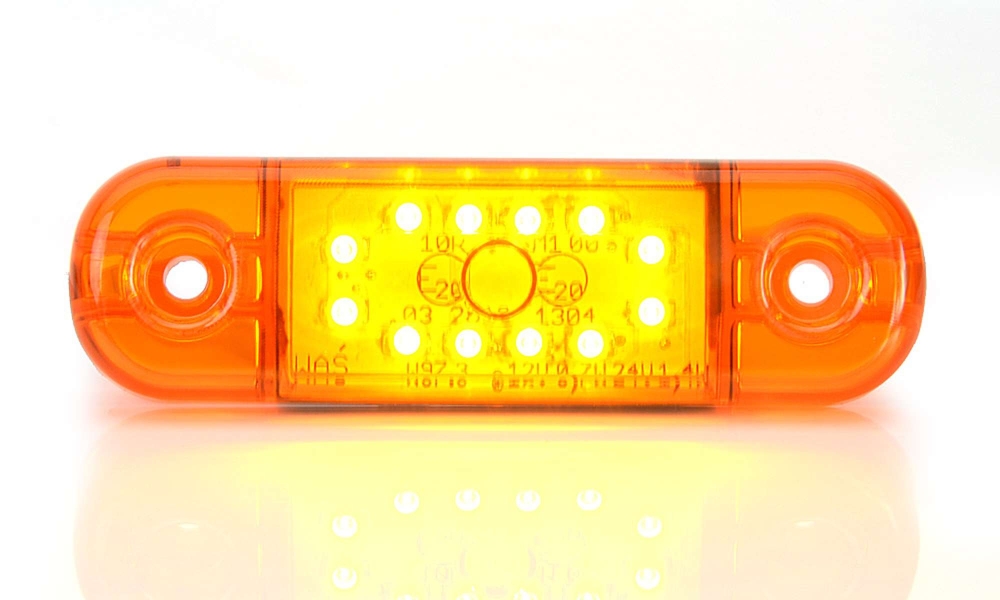 Slank LED sidemarkeringslys med 12 dioder og oransje glass, enkel installasjon og brukervennlig design.